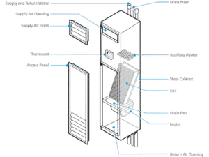 Fan coils consist of two critical components – a fan and a coil. They function by drawing room air through a filter, then passing it over a coil containing heated or chilled water, adjusting the air temperature. The fan ensures consistent circulation within the suite.